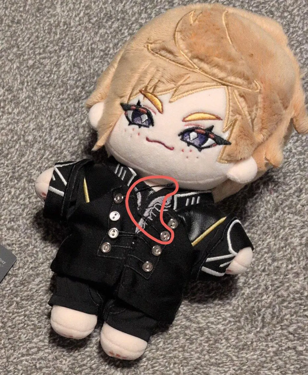 My complaints are pretty small in comparison to how happy I am with my purchase. His pants slide off his little cheeks when I pose him to sit (it's fine we hike them back up), his shoes don't really stay on his feet too well (I leave them at home so they don't disappear), couple loose tufts in his hair (very easy to pluck off), and the string clasp on his jacket pulled apart when I tried putting it on him for the first time (shown circled in my photo, I can probably sew it back).