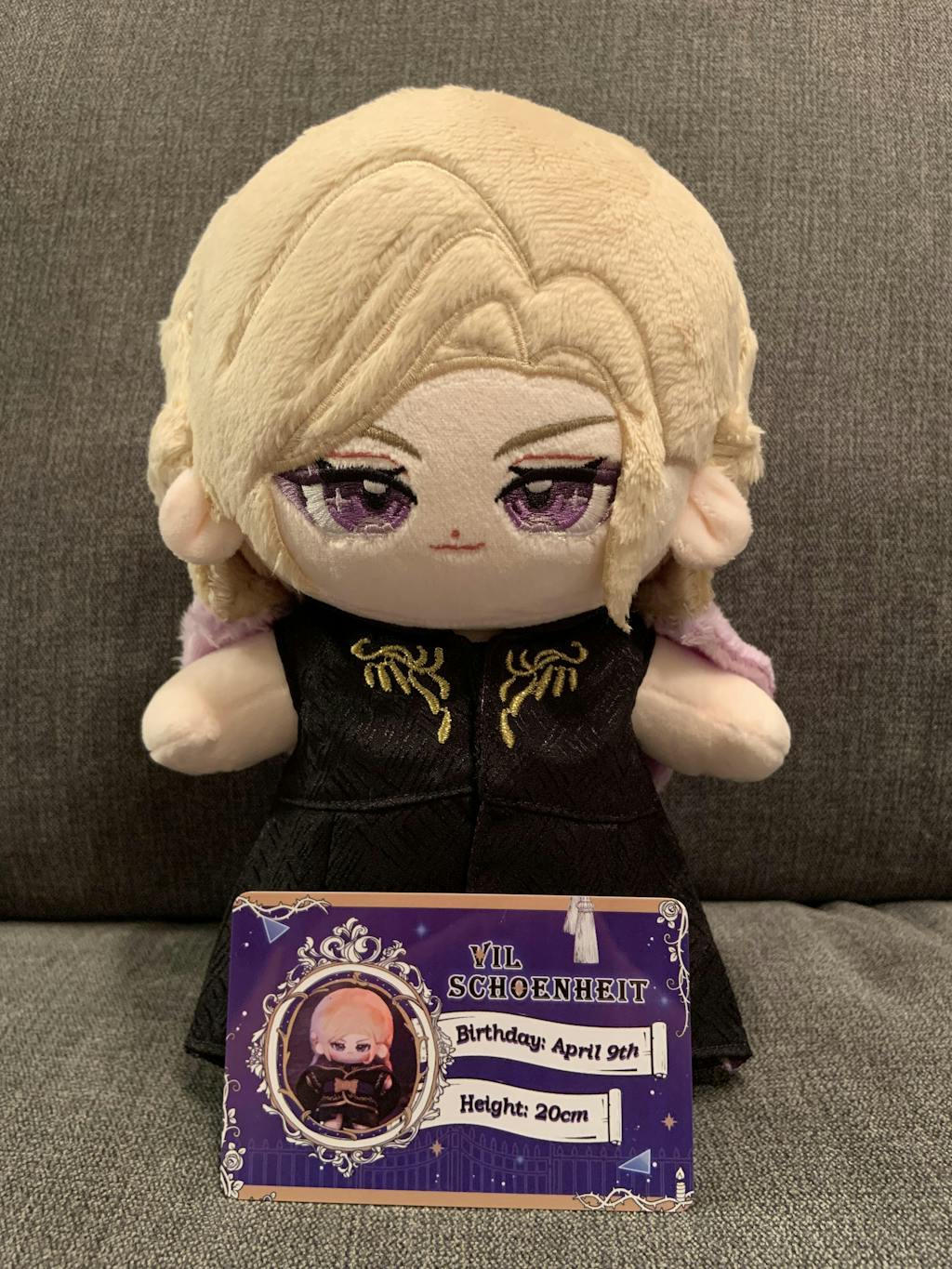 I wasn't sure what Vil would look like as there are no photos of him on this site or other social media accounts. I purchased him anyway because I love Vil and let me tell you - he's one of the MOST BEAUTIFUL plushies I've ever gotten. His hair is long and blonde with his signature light-purple tips. My absolute favourite thing is his eyes - they're genuinely amethyst. The bangs around the side of his face are moveable - you can lift them and see that one of his eyes has his signature purple eyeshadow. One thing I will bring up is that the embroidery on his chest does not have the 'white' on the golden chandelier that is advertised in his photo above. For me, this isn't a problem so I didn't retract a star. Overall 100/10 - look at him - even his adorable plushie poses like a Queen!! If you love Vil and are on the fence, please consider giving him a home - he's really, really wonderful! <3